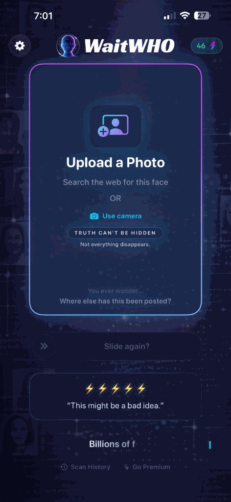 WaitWHO is a face-search app. Upload a photo and we search publicly available images across the web for visually similar matches, so you can review what may be publicly visible.